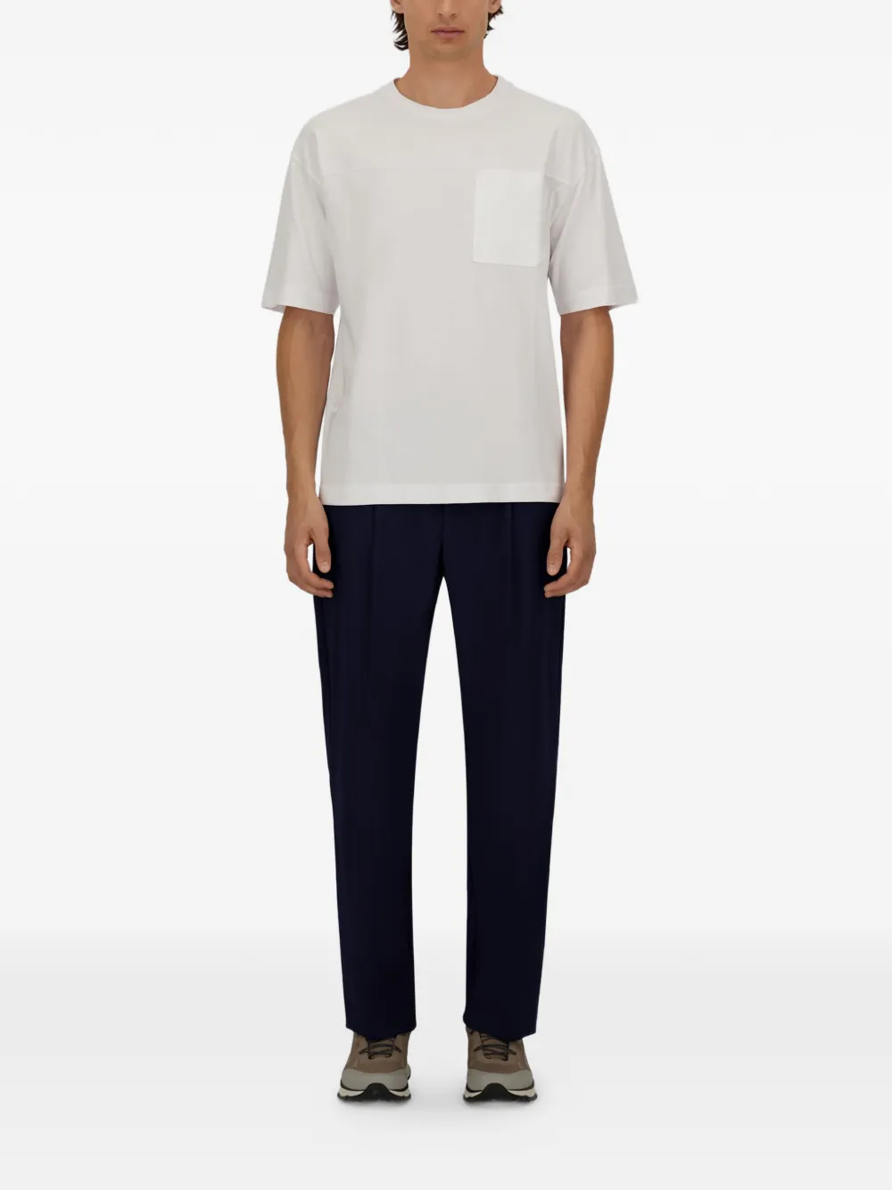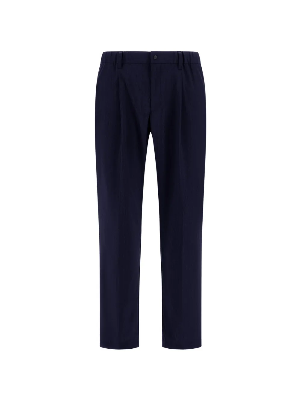 navy blue elasticated waistband pressed creases logo detail scoop pockets