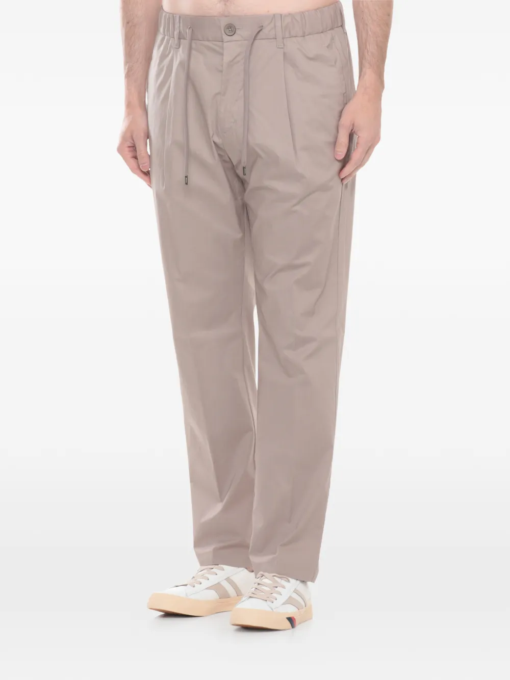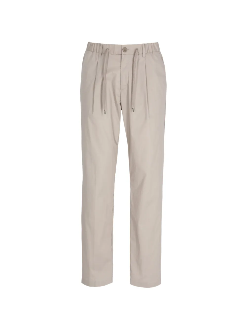 beige elasticated drawstring waistband front button and zip fastening two side inset pockets rear patch pocket