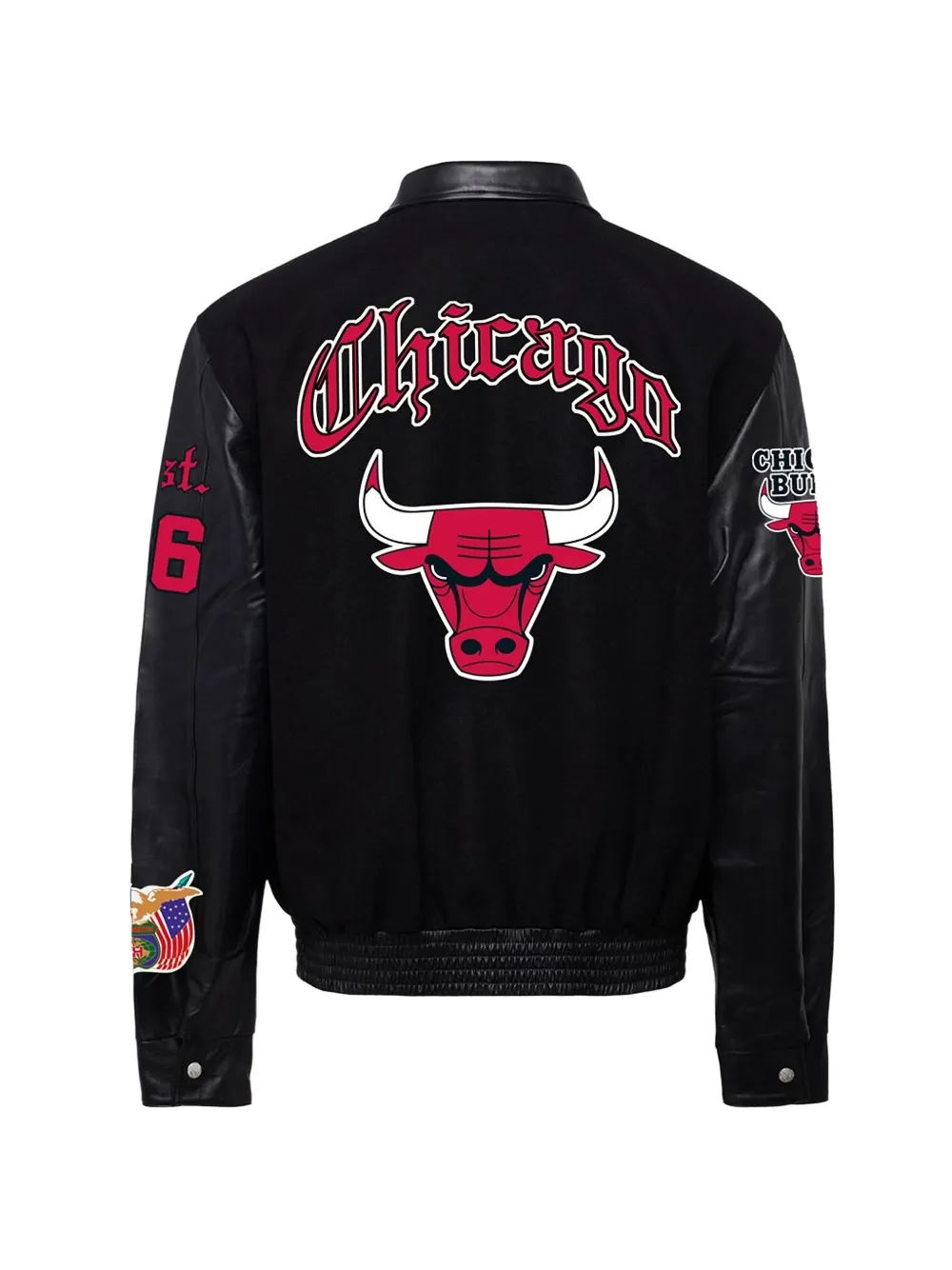 black leather sleeves ribbed hem snap fastening logo patch