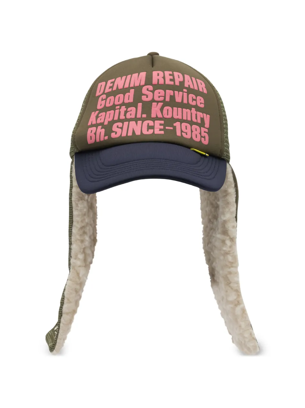 brown text print ear flaps mesh panels curved peak adjustable strap