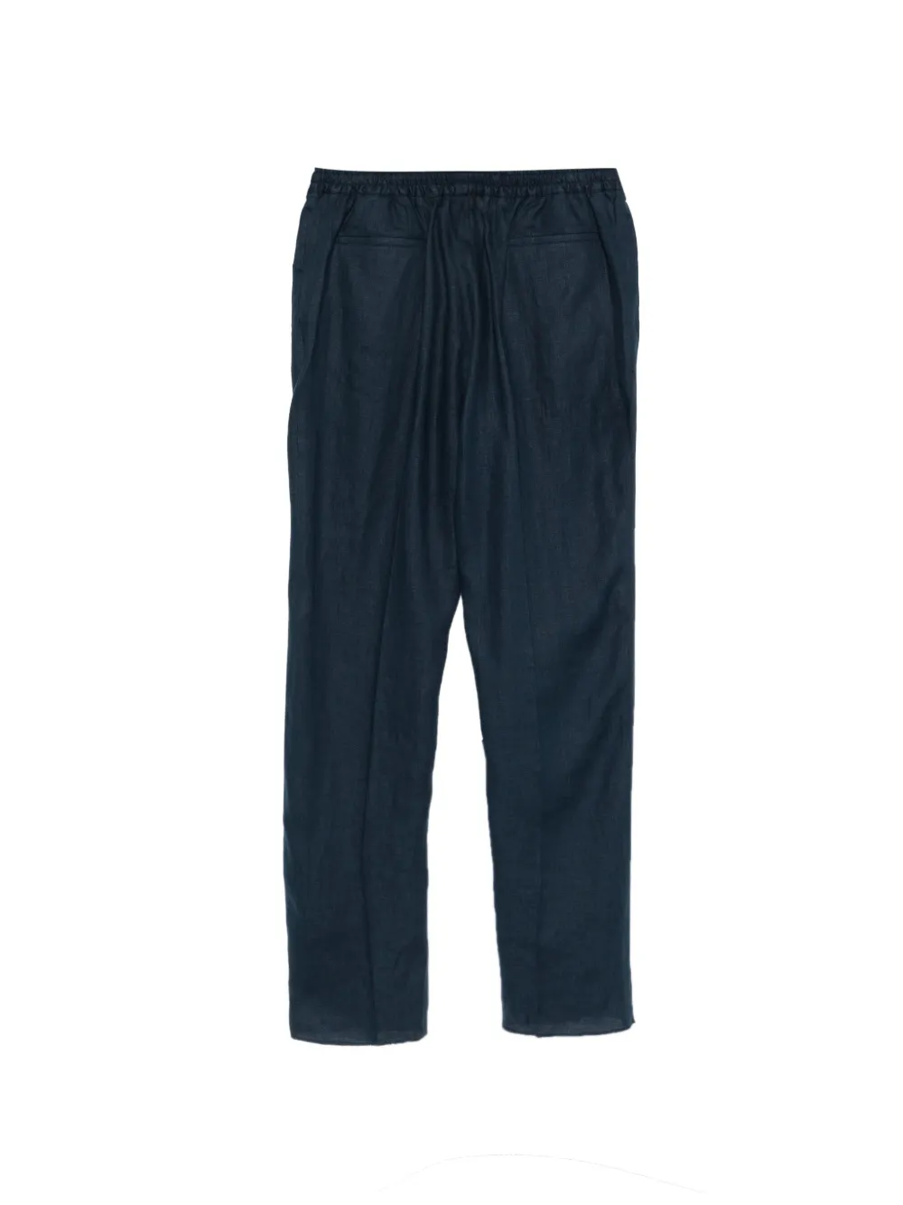 navy blue elasticated waistband front button fastening pleated front straight leg slip pockets