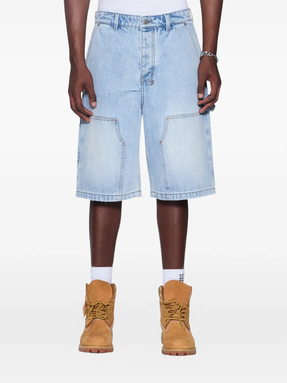light blue carpenter-style paneling carpenter pocket cut-away front pockets back patch pockets button fly closure woven pocket tag cotton