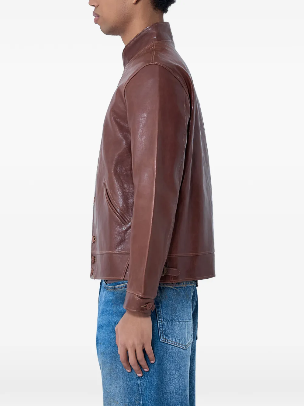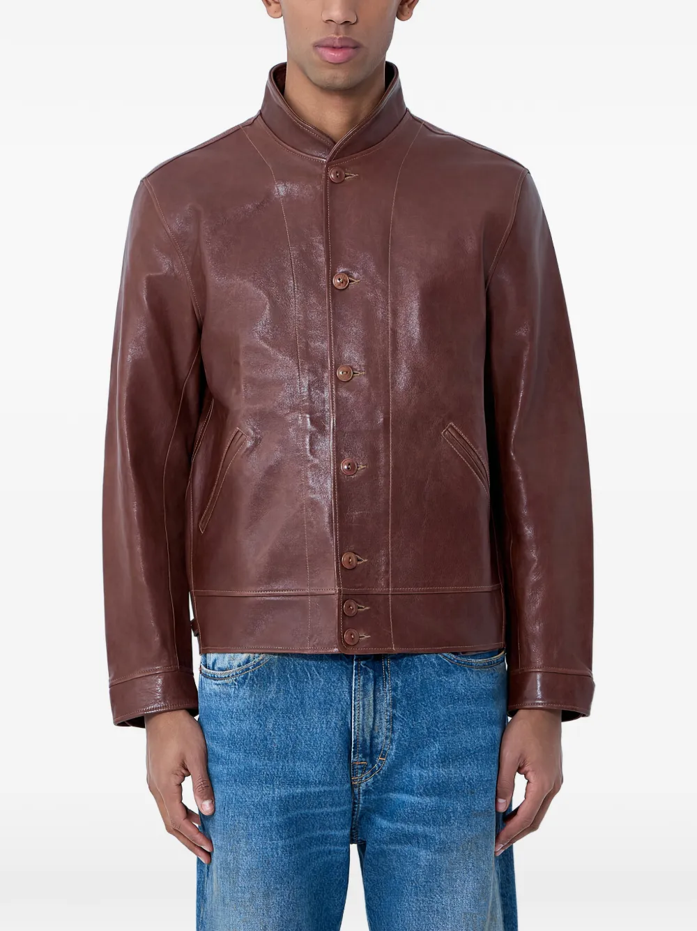 brown button fastening high neck side slip pockets long sleeves