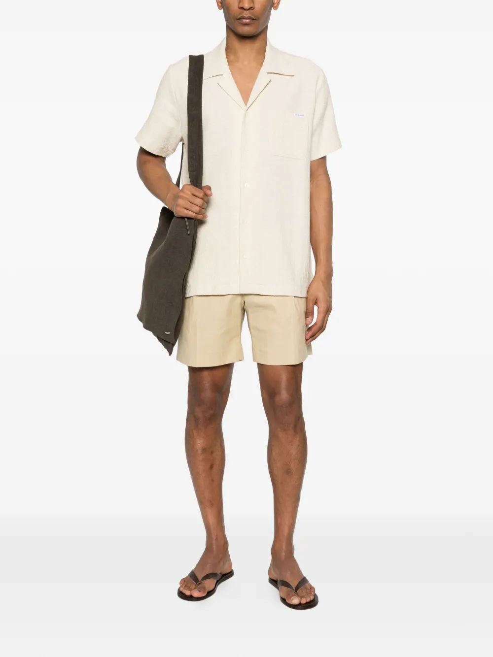 beige camp collar patch pocket button fastening short sleeves