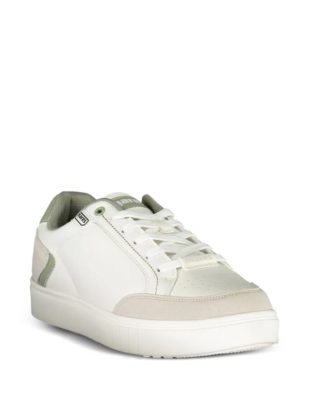 white suede overlays sage green details perforated toebox front lace-up fastening logo patch at the tongue padded collar flat rubber sole
