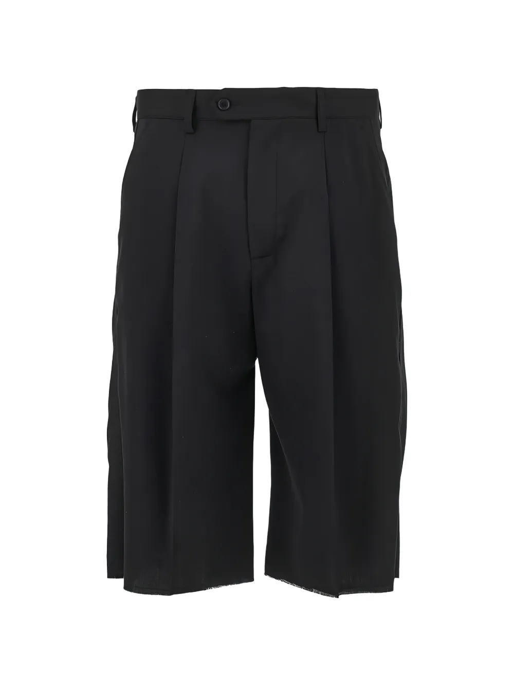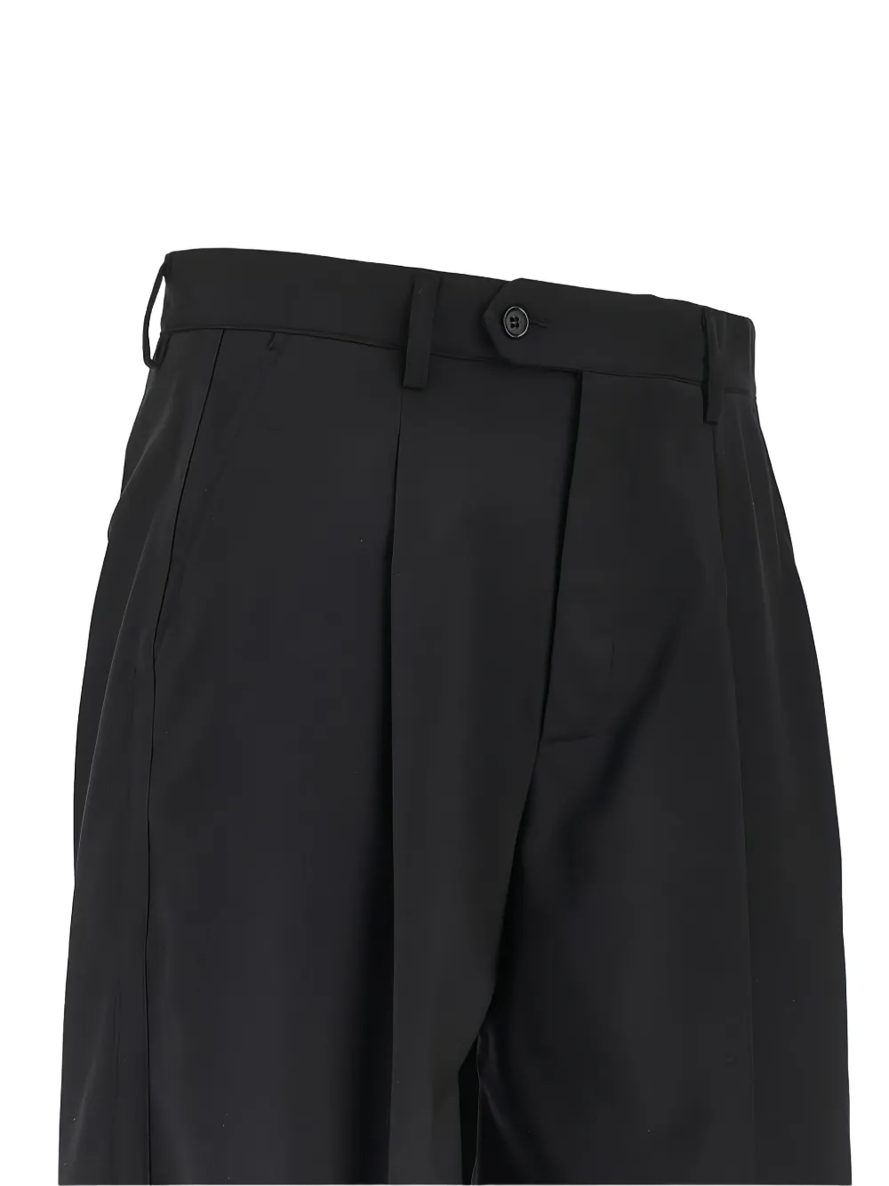 black belt loops front button and fly fastening pleat detail two side inset pockets pressed crease raw-cut hem
