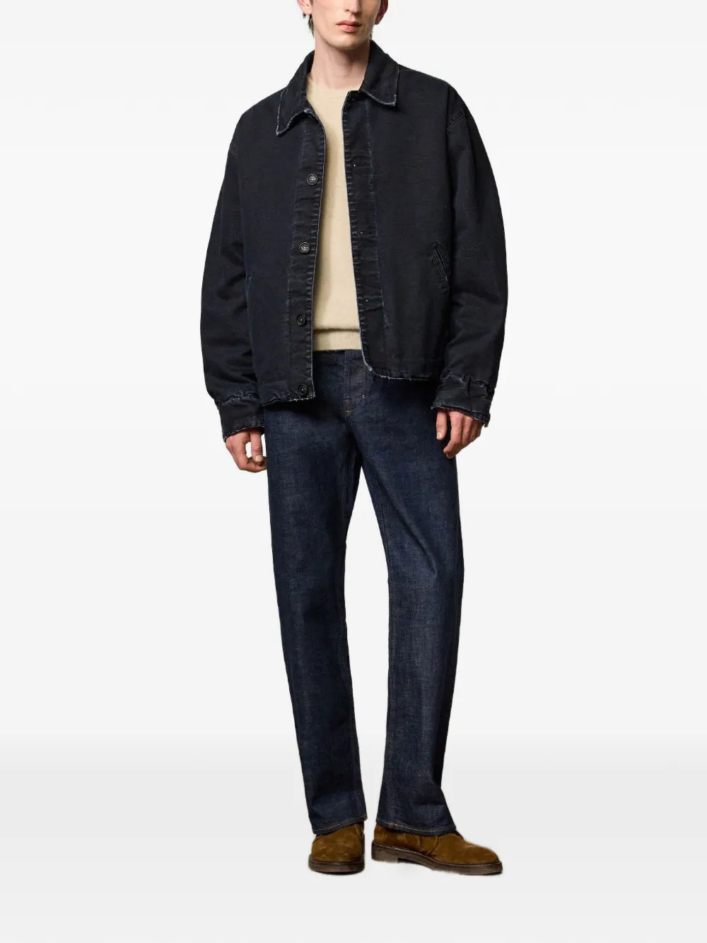 dark blue front button fastening two side welt pockets