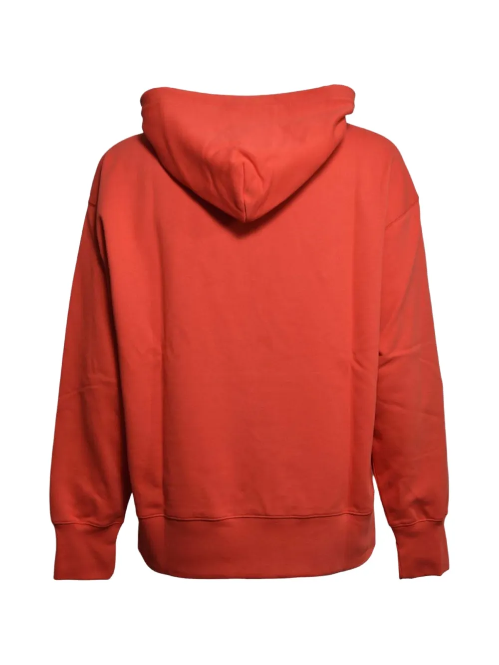 bright red logo hood front pouch pocket ribbed hem