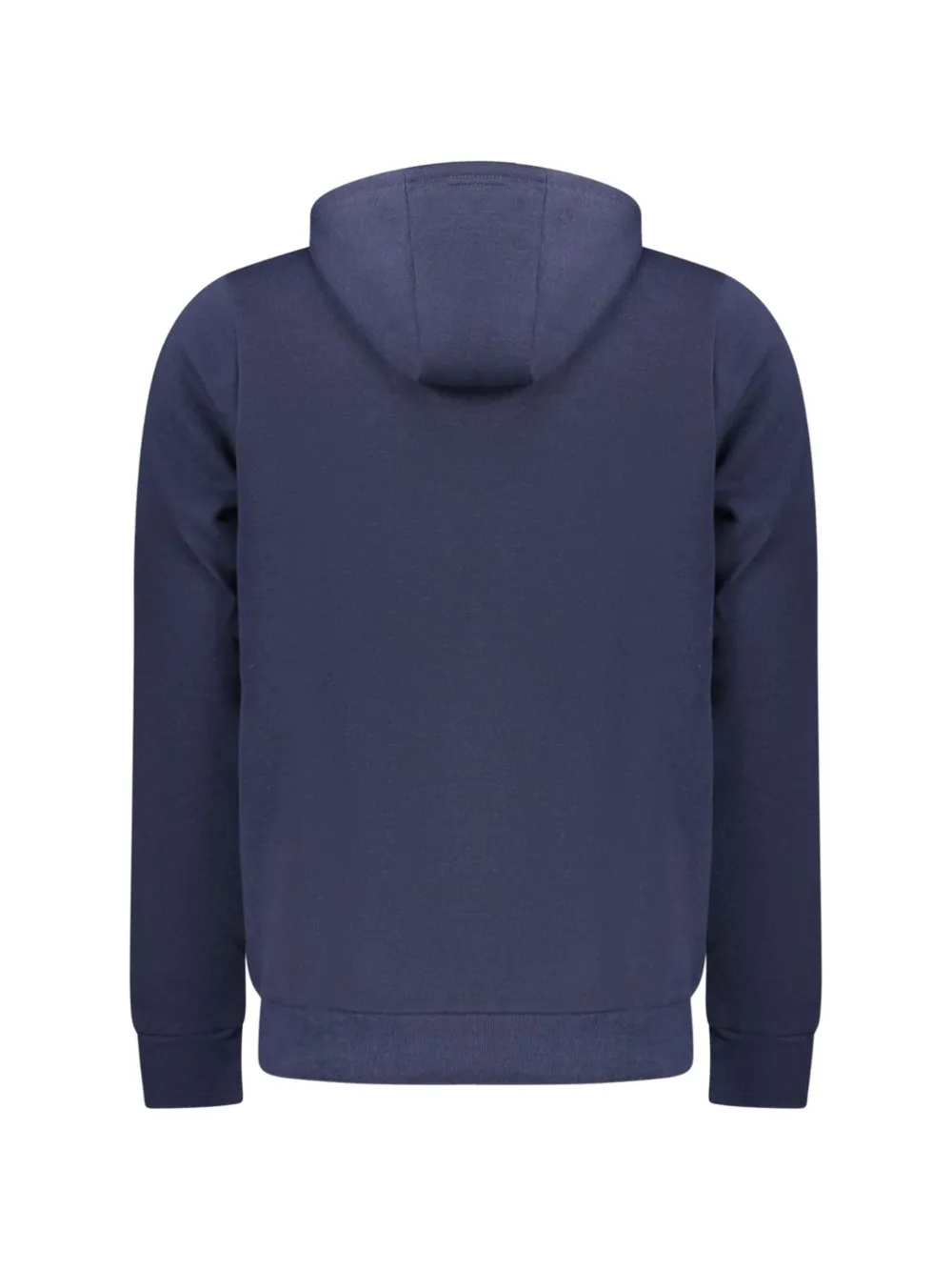 blue cotton drawstring hood long sleeves front flap pocket logo patch to the front ribbed cuffs ribbed hem