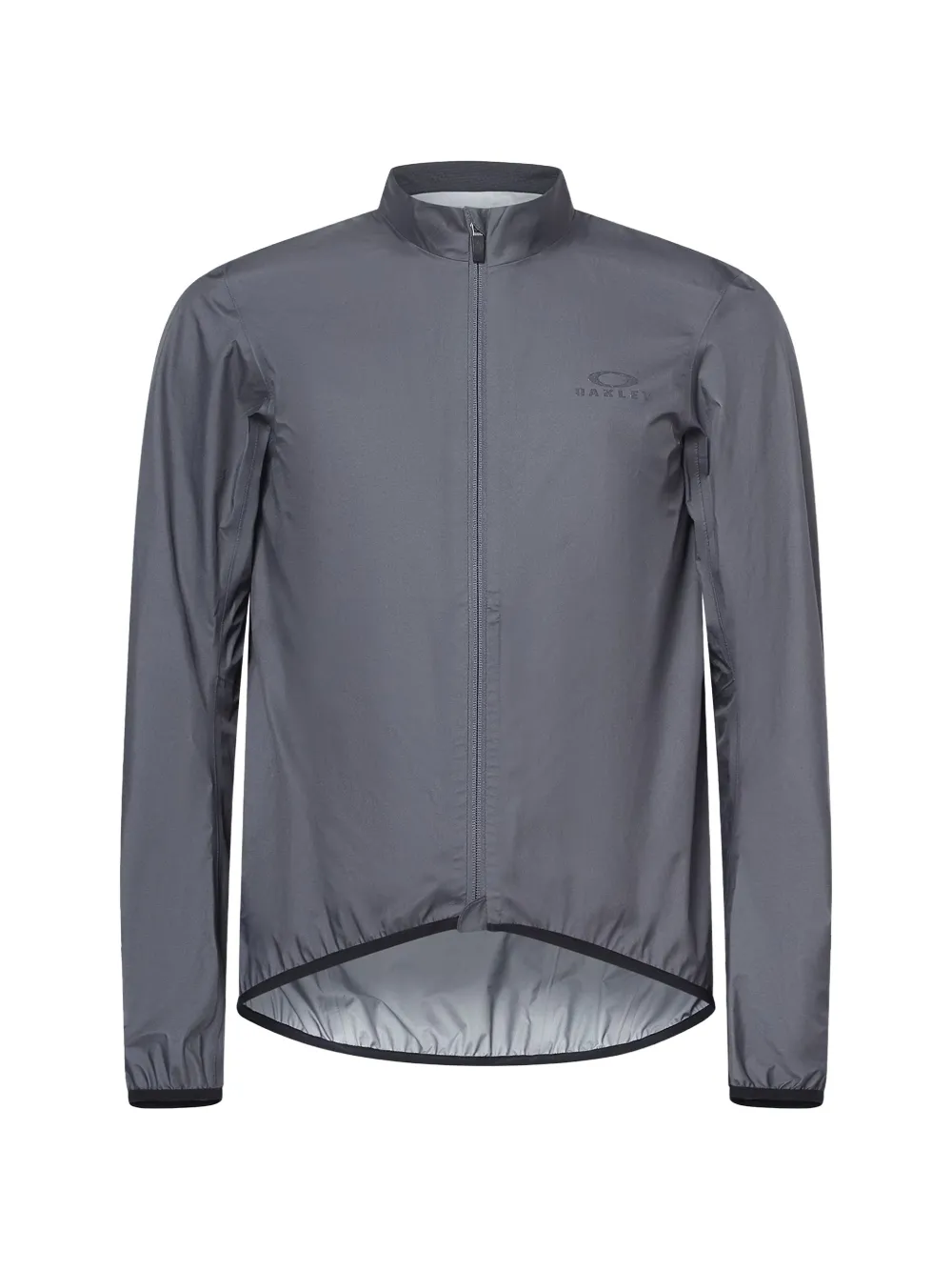 grey lightweight shell texture front zip fastening high neck long sleeves logo print at the chest elasticated cuffs curved hem