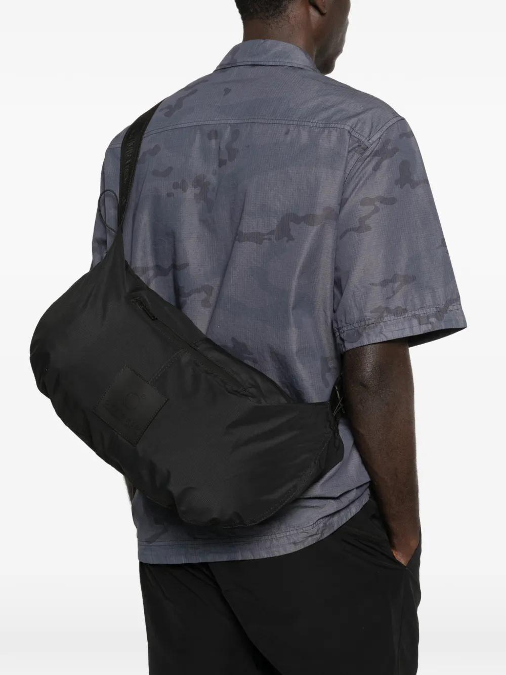 black adjustable strap front zip pocket logo patch buckle fastening top zip fastening