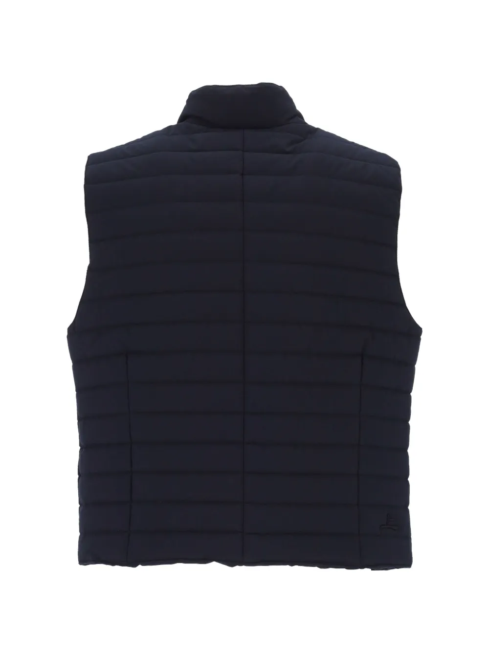 dark blue button fastening stand-up collar welt pockets sleeveless padded design