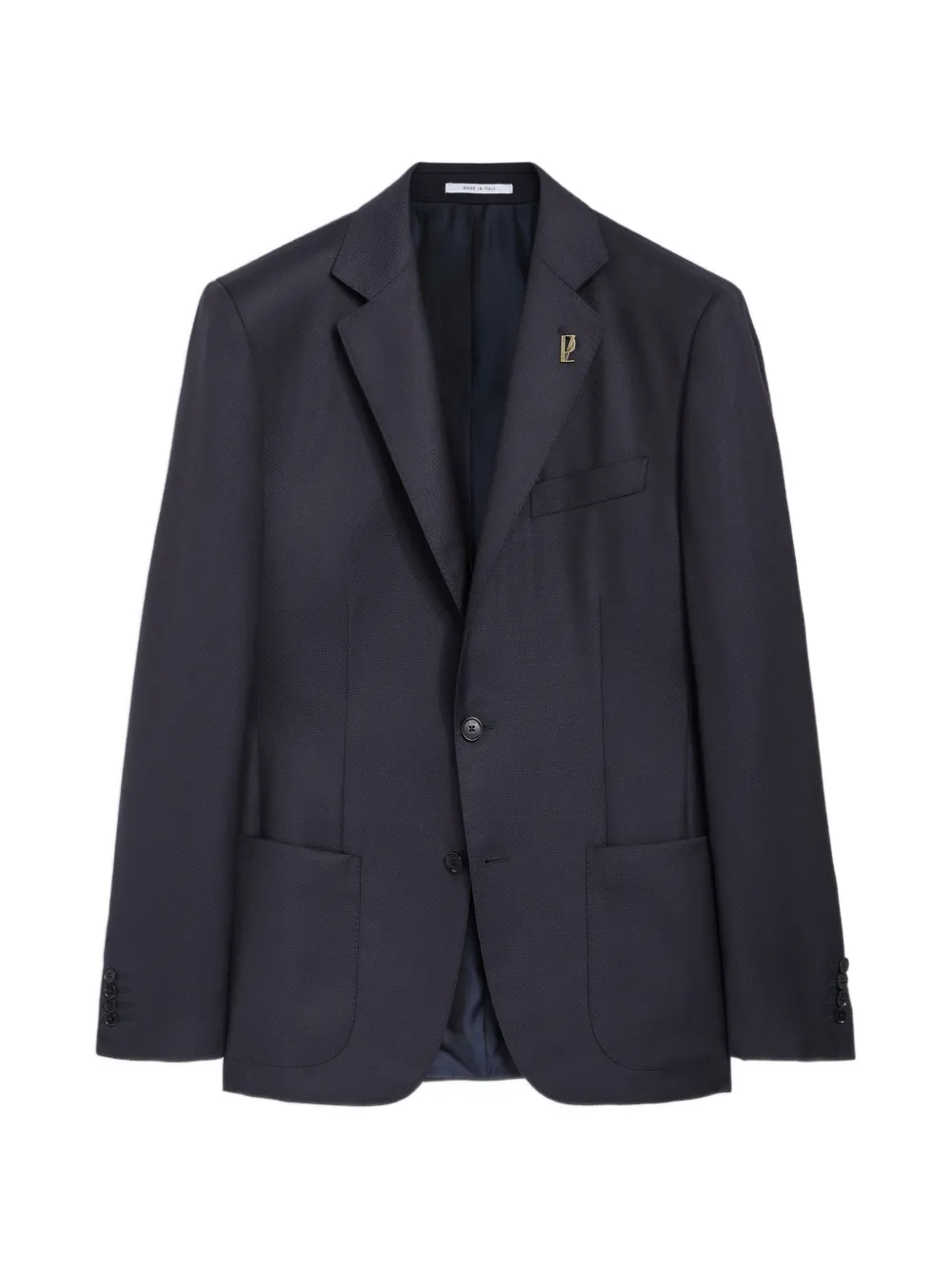 navy blue two-button fastening notched lapels chest welt pocket patch pockets long sleeves buttoned cuffs
