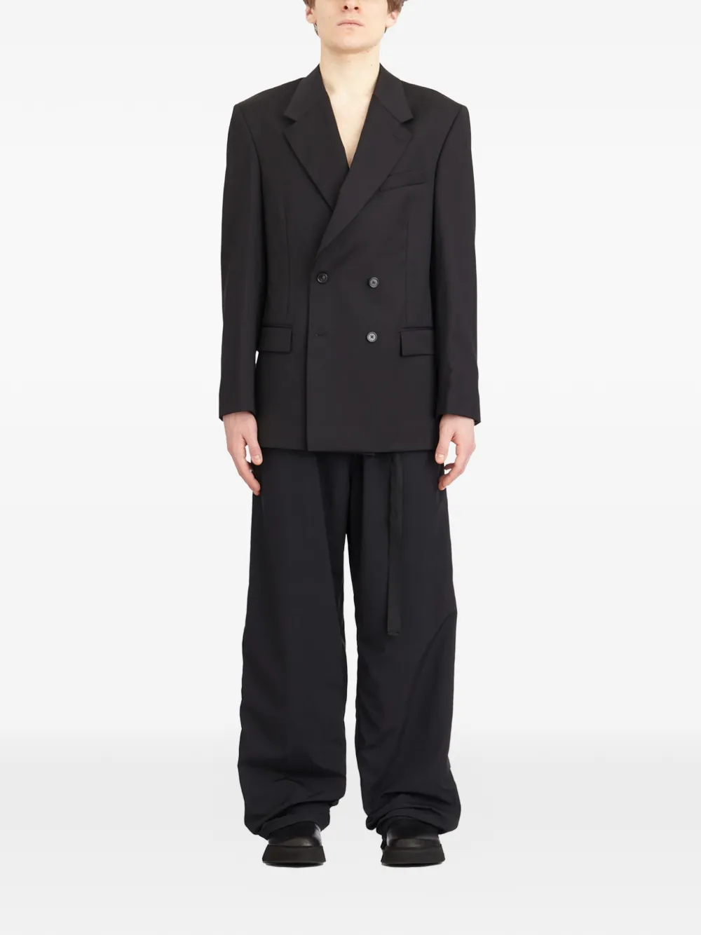 black double-breasted notched lapels flap pockets button fastening