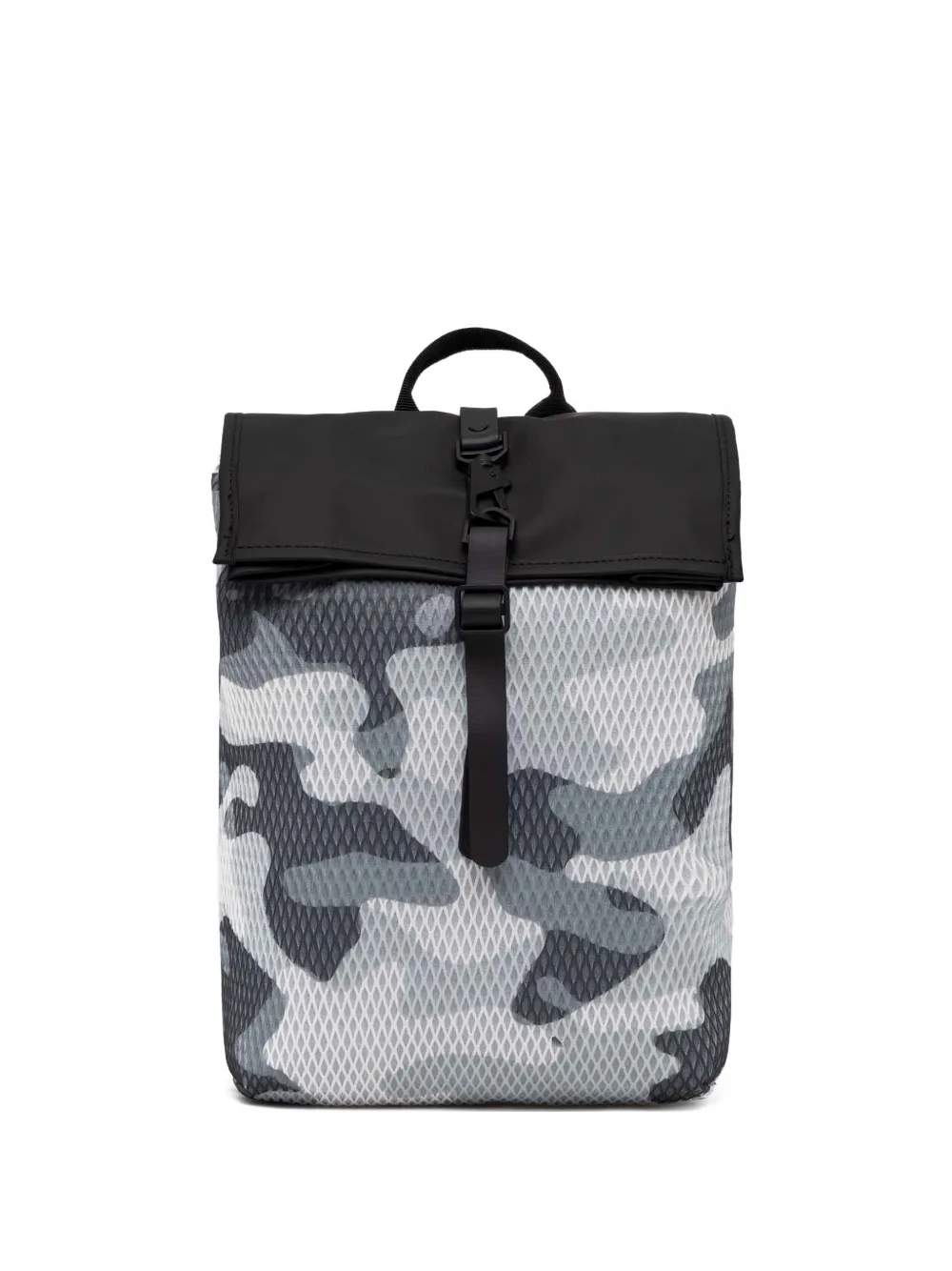 grey and black camouflage pattern top handle flap top buckle fastening adjustable strap clip detail