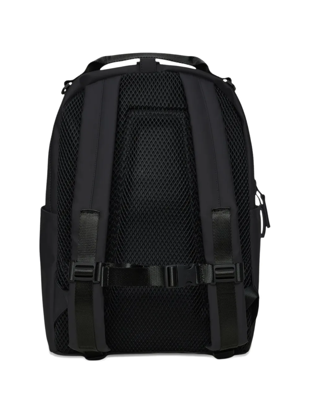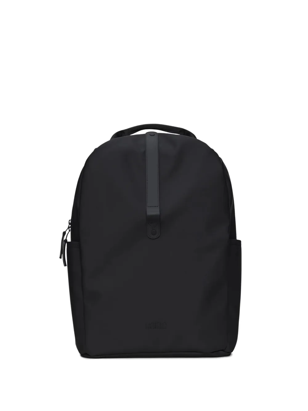 black matte finish single top handle adjustable shoulder straps mesh back panel zip-fastening main compartment side slip pockets debossed logo to the front
