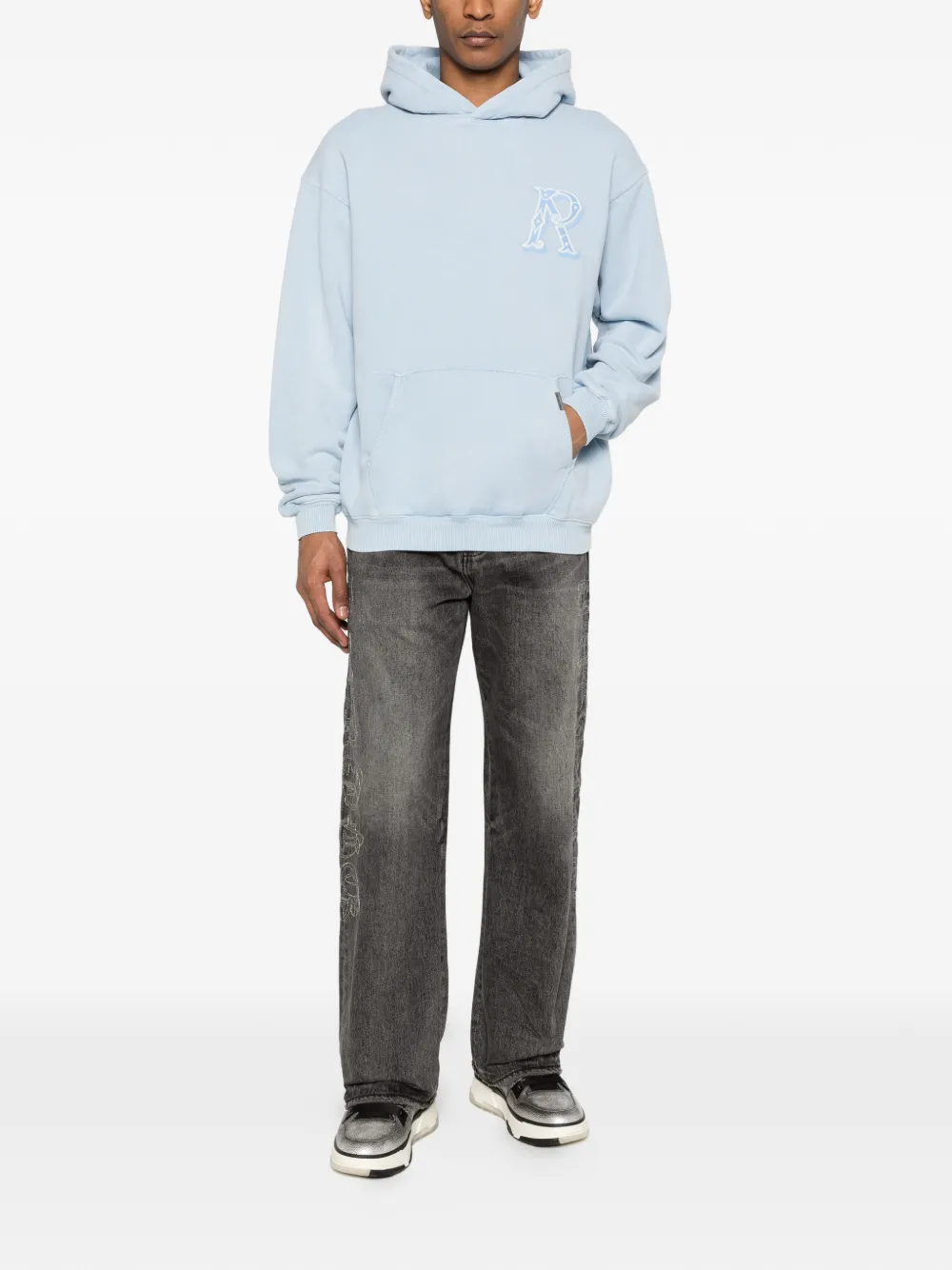 azul claro bordado Western Initial bolsillo en la parte delantera manga larga dobladillo y puños de canalé