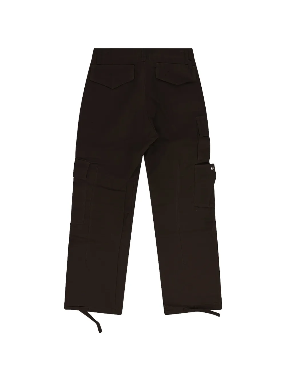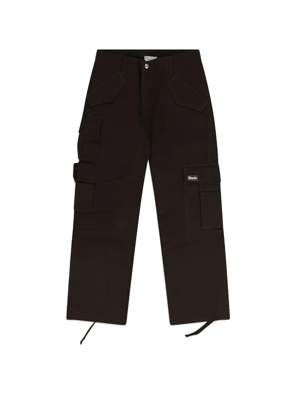 brown belt loops front button and zip fastening two side flap pockets multiple side cargo pockets two rear flap pockets logo patch to the side drawstring cuffs