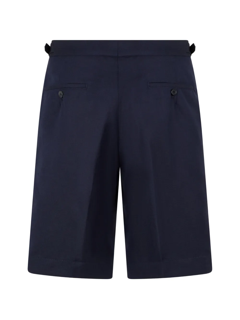 navy blue button fastening pleated belt loops buttoned back pockets