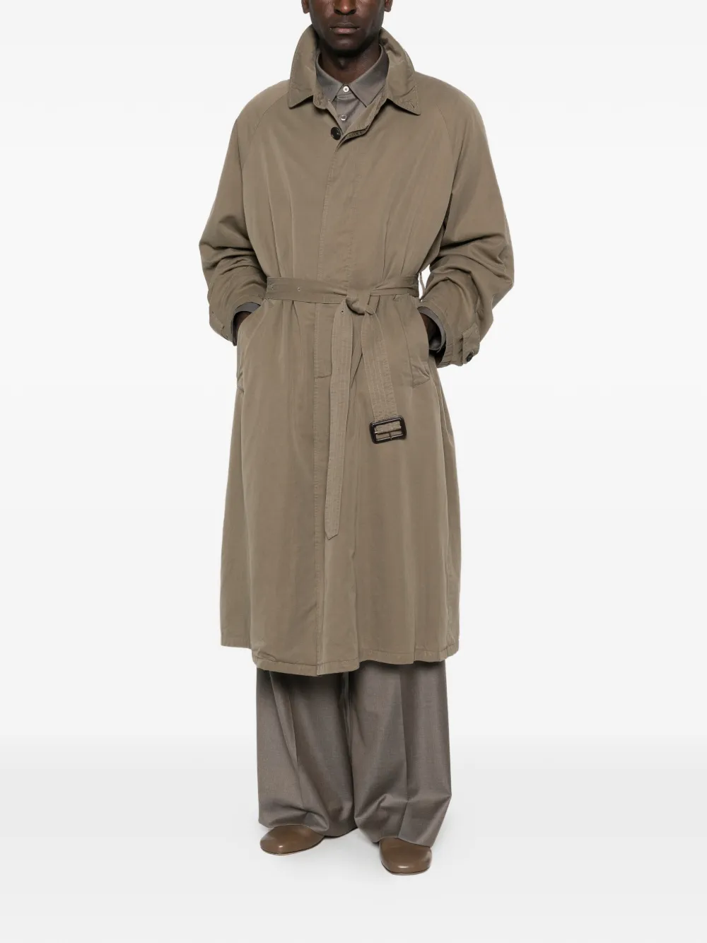 beige button fastening belted waist two pockets long sleeves buttoned cuffs