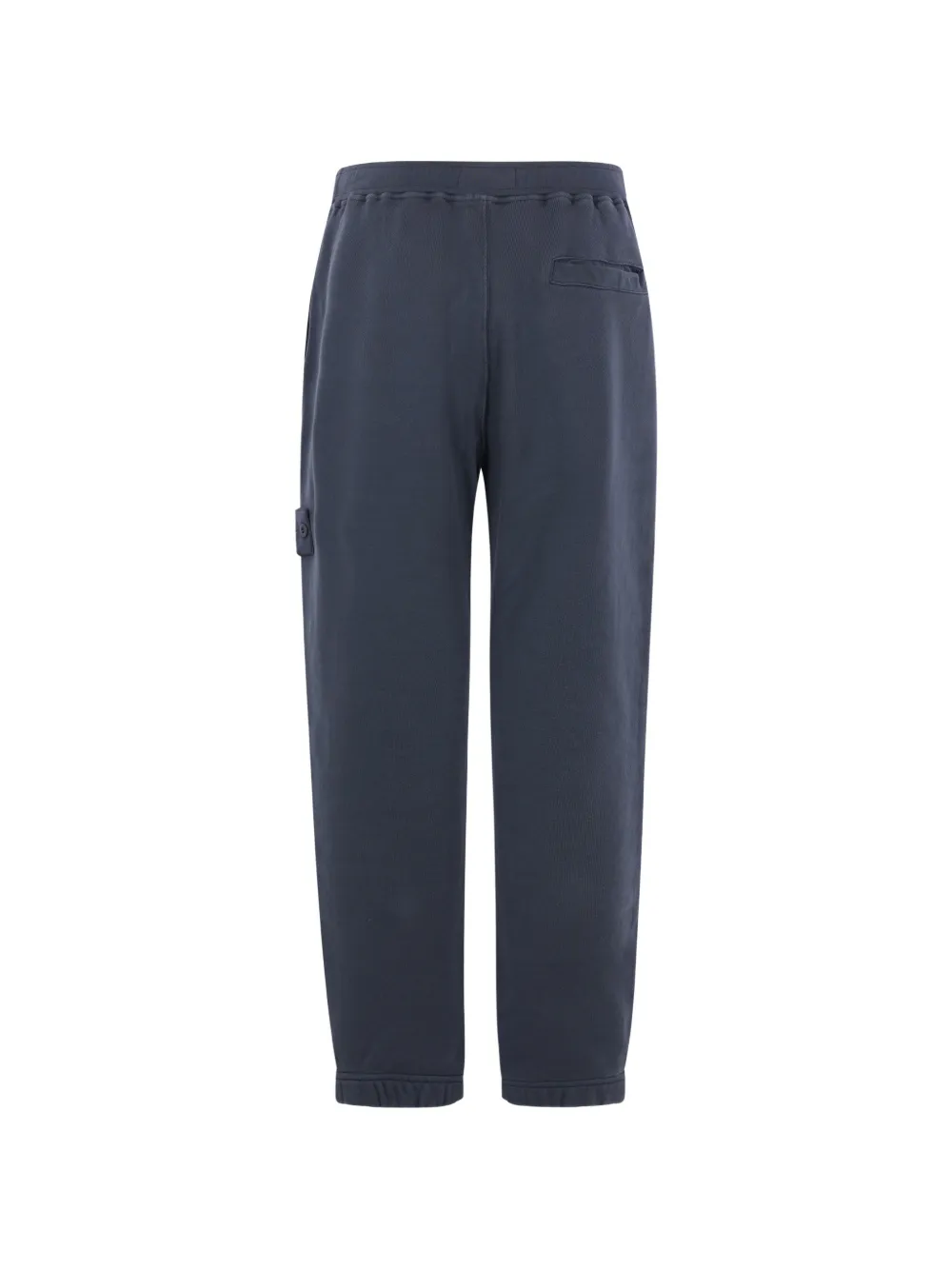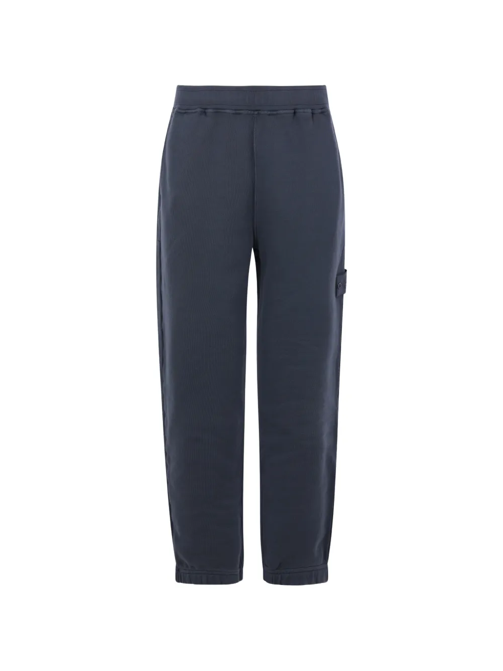 blue elasticated waistband logo patch two side slit pockets rear welt pocket elasticated ankles