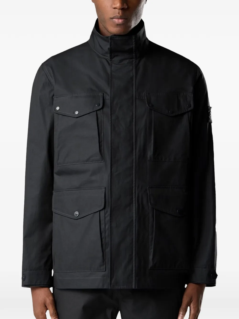 black button fastening stand-up collar multiple pockets long sleeves