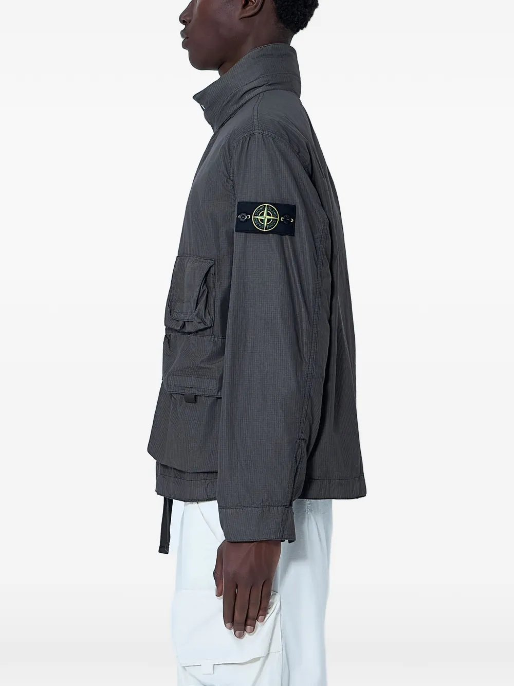 grey ripstop texture high stand collar packable hood concealed zip fastening multiple flap pockets logo patch at the sleeve long sleeves buttoned cuffs
