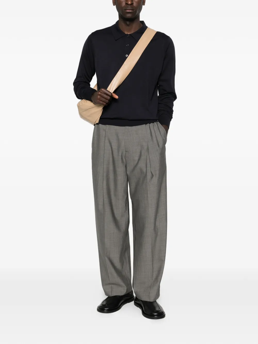 dark navy button closure long sleeves polo collar straight hem