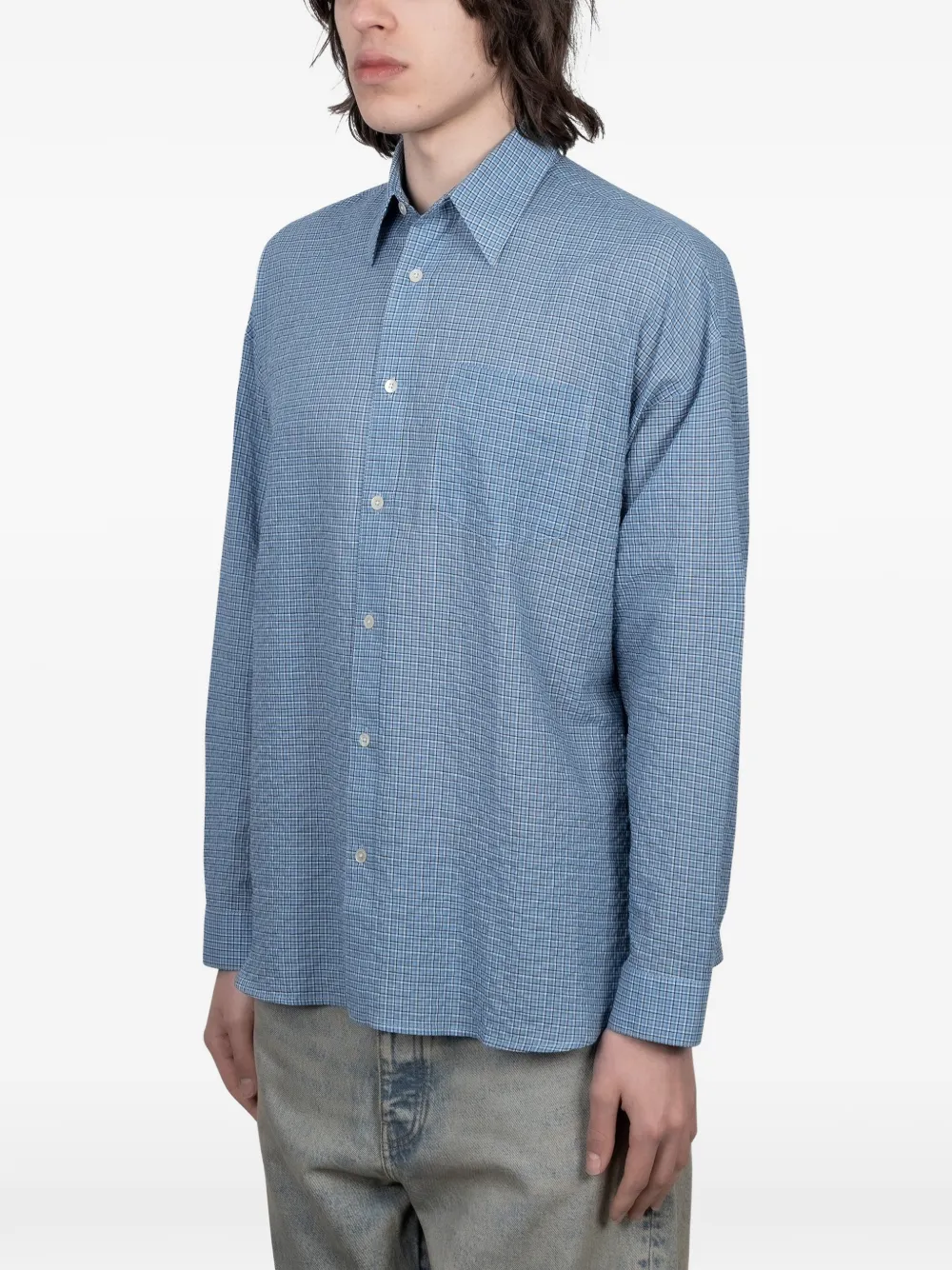 blue check chest pocket button fastening long sleeves buttoned cuffs
