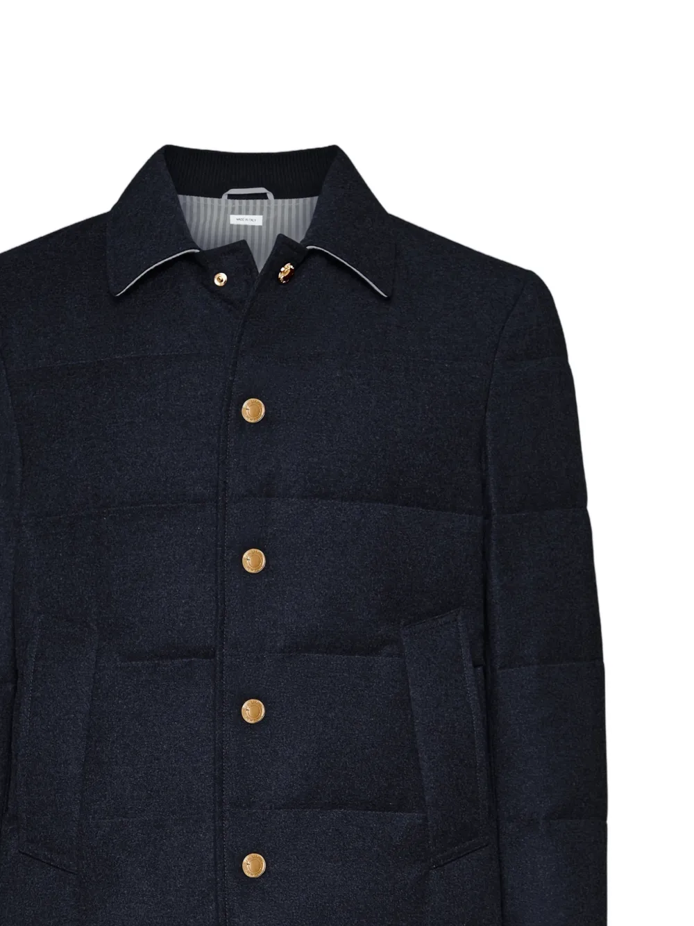 navy blue padded design button fastening point collar front flap pocket gold-tone hardware