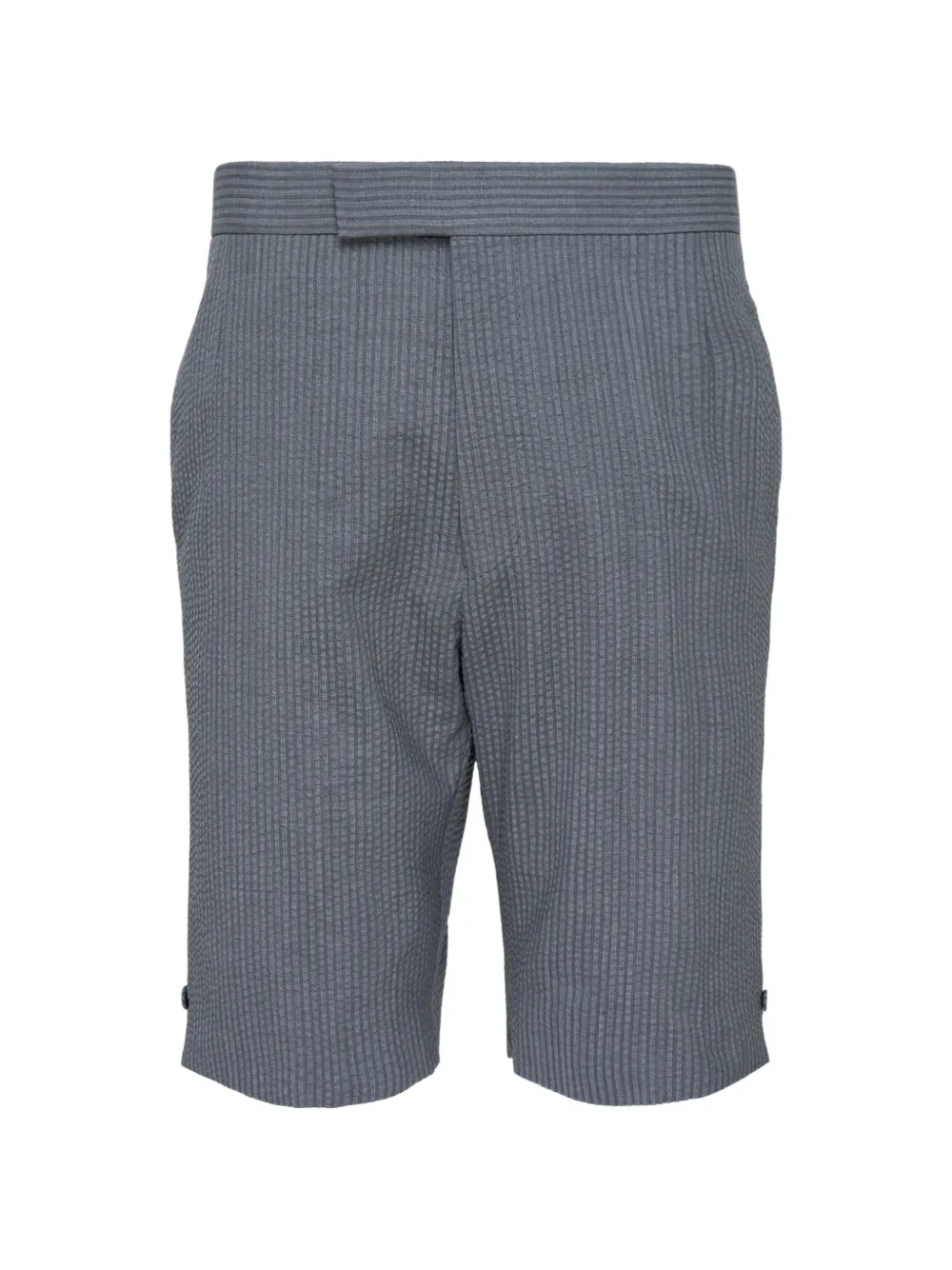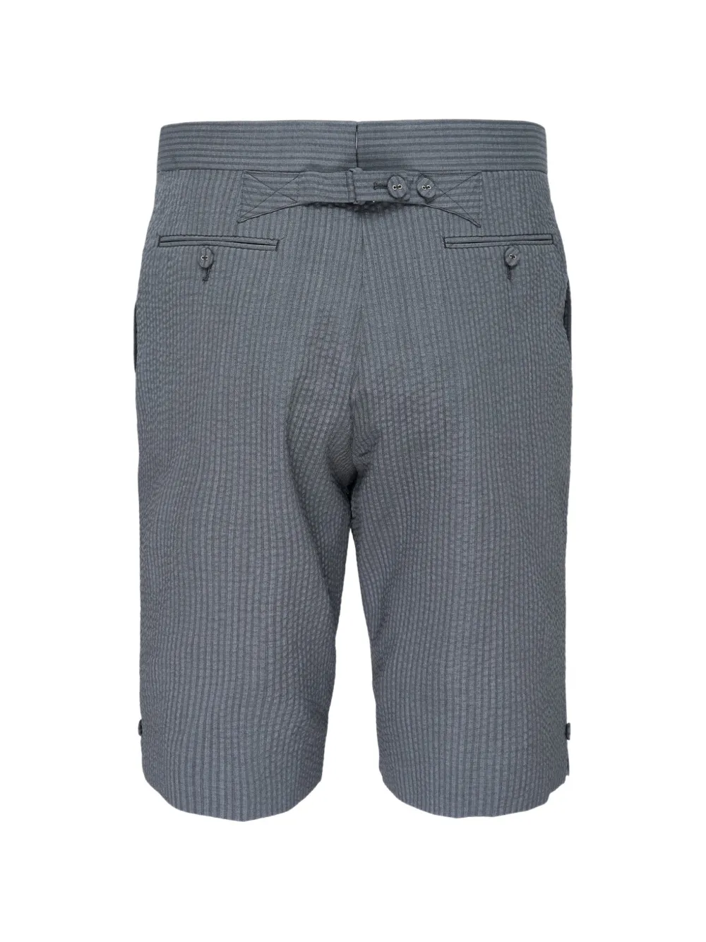 grey pinstripe pattern adjustable back strap rear button-fastening jetted pockets side-slit pockets concealed-front fastening buttoned cuffs