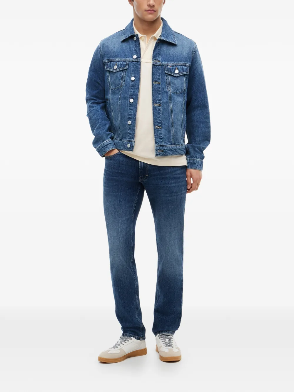 blue faded wash logo patch to the rear spread collar front button fastening long sleeves buttoned cuffs two chest flap pockets two side slit pockets straight hem