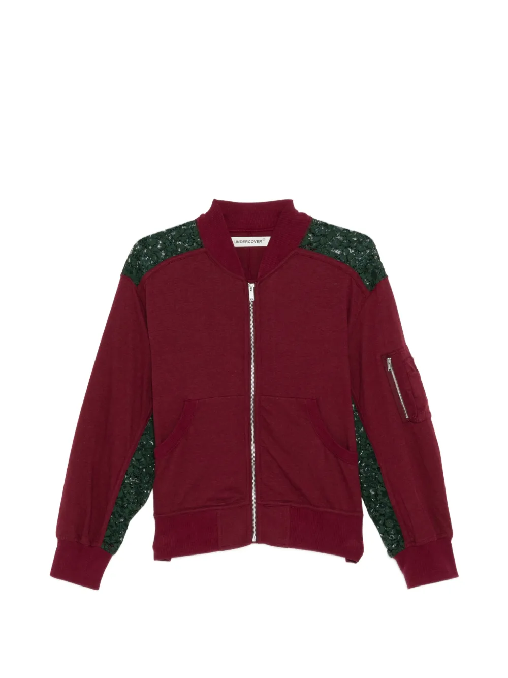 red cutwork detailing zip fastening ribbed hem ribbed cuffs side welt pockets sleeve zip pocket