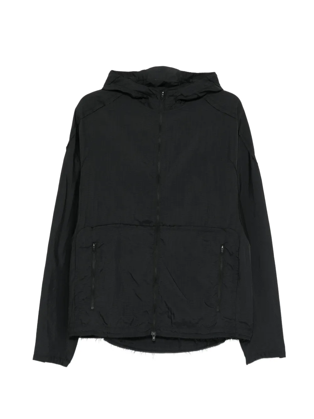 black hooded front zip fastening front zip pockets raw-cut hem