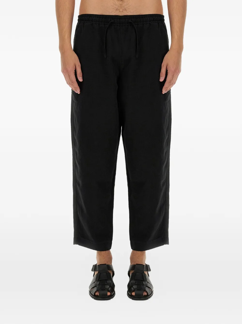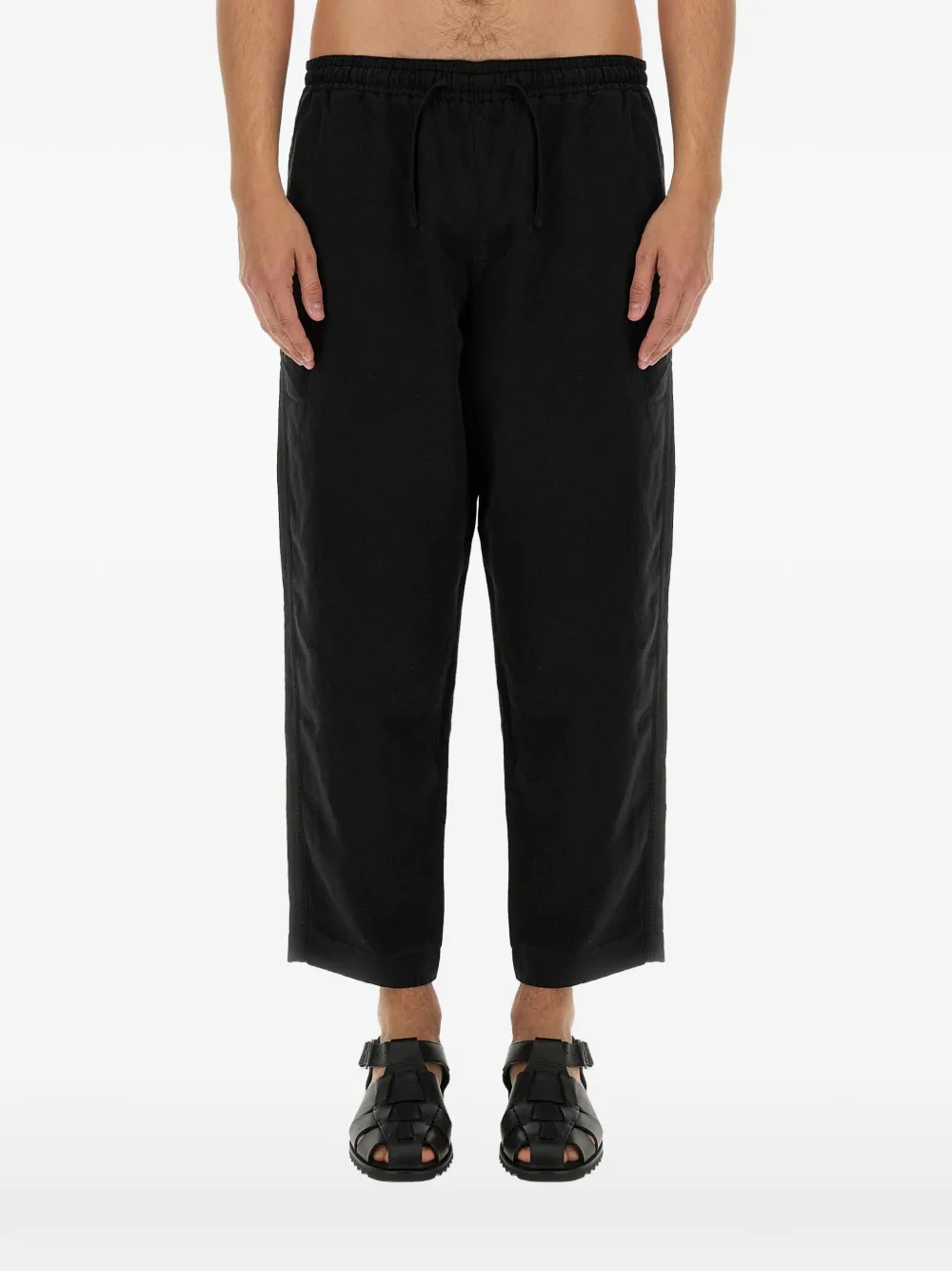 black elasticated drawstring waist two side inset pockets rear patch pocket straight leg tonal topstitching