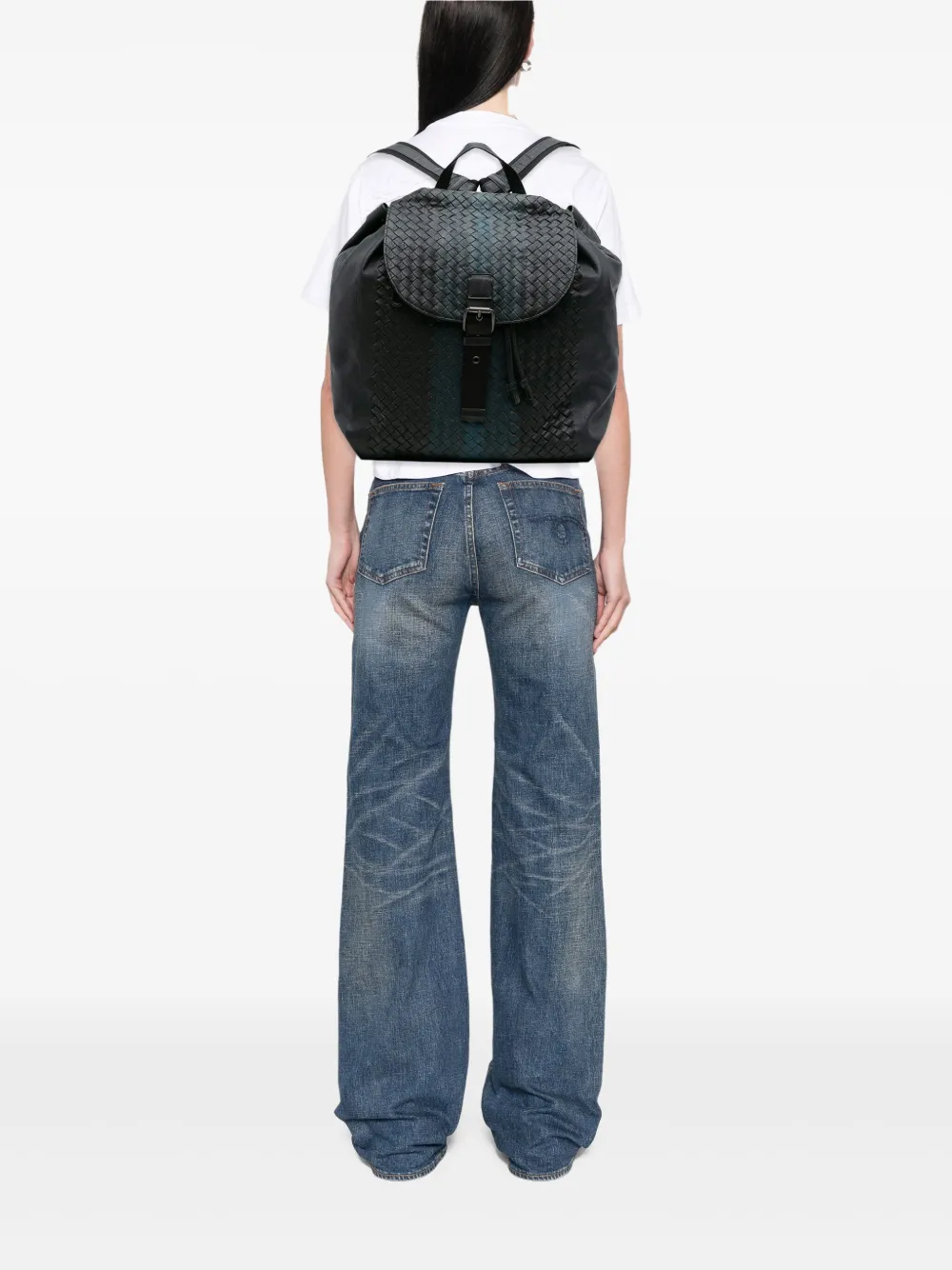 - front woven leather flap with buckle and drawstring closure