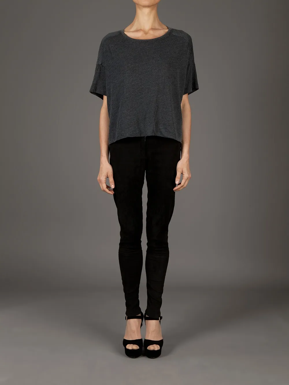 Grey cotton cropped top from Raquel Allegra featuring a scoop neck, short sleeves, tonal lace panel to the back and a hem lower at the back than the front.
