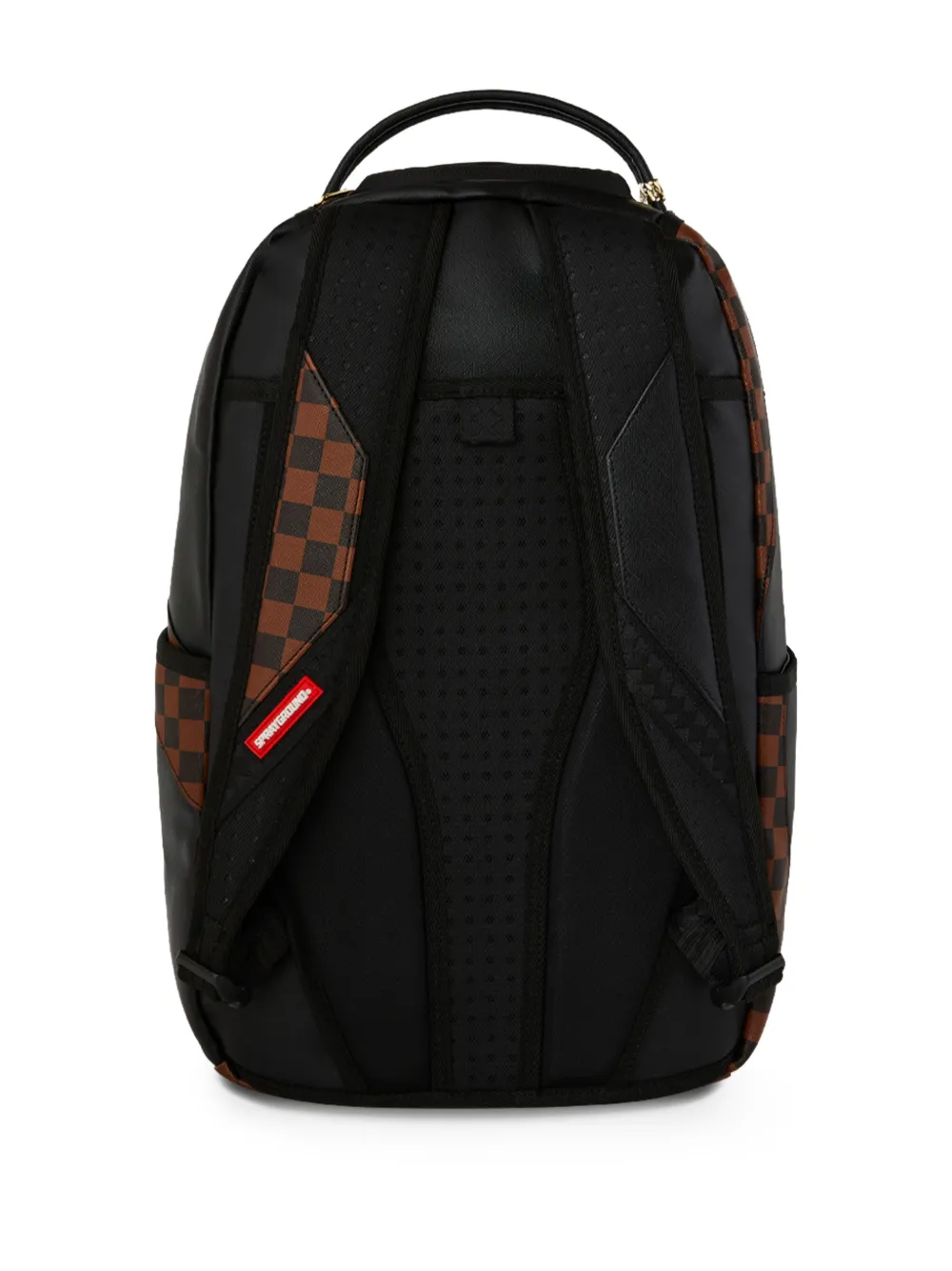 brown and black check pattern embossed detail top handle zip fastening logo detail