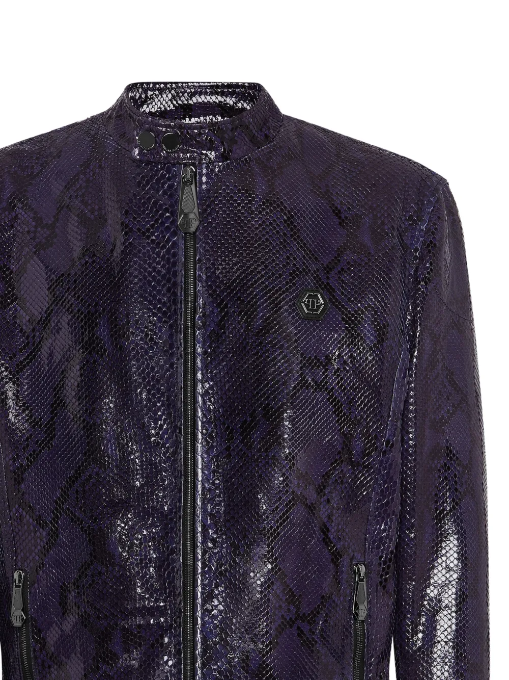 dark blue python leather snakeskin effect press-stud band collar front zip fastening long sleeves two front zip-fastening pockets logo patch at the chest silver-tone hardware diamond quilted satin lining Unfortunately, we are unable to ship this item outside of the EU & UK.