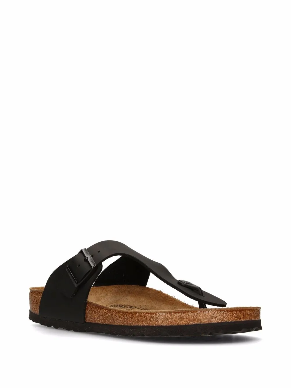 Detalle decorativo de hebilla, puntera redonda, estilo tanga y suela plana de goma.