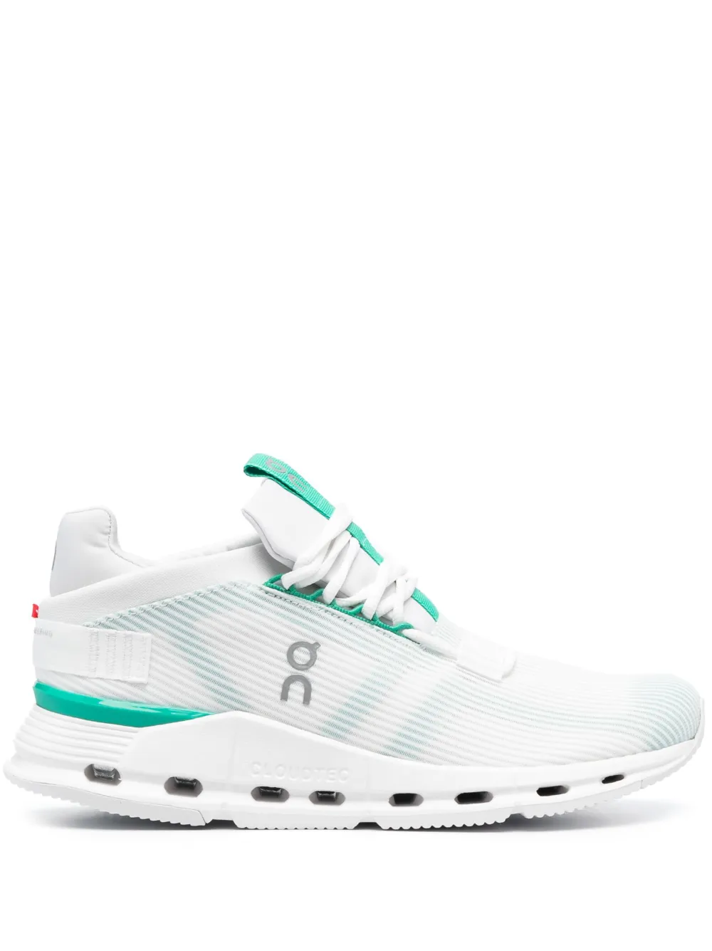 Blanco, verde menta, diseño en paneles color block, logo estampado en el lateral, logo estampado en la lengüeta , logo en relieve en el lateral, plantilla con logo, logo en el contrafuerte, solapa en la lengüeta, cierre con agujetas en la parte delantera, puntera redonda y suela plana de goma.