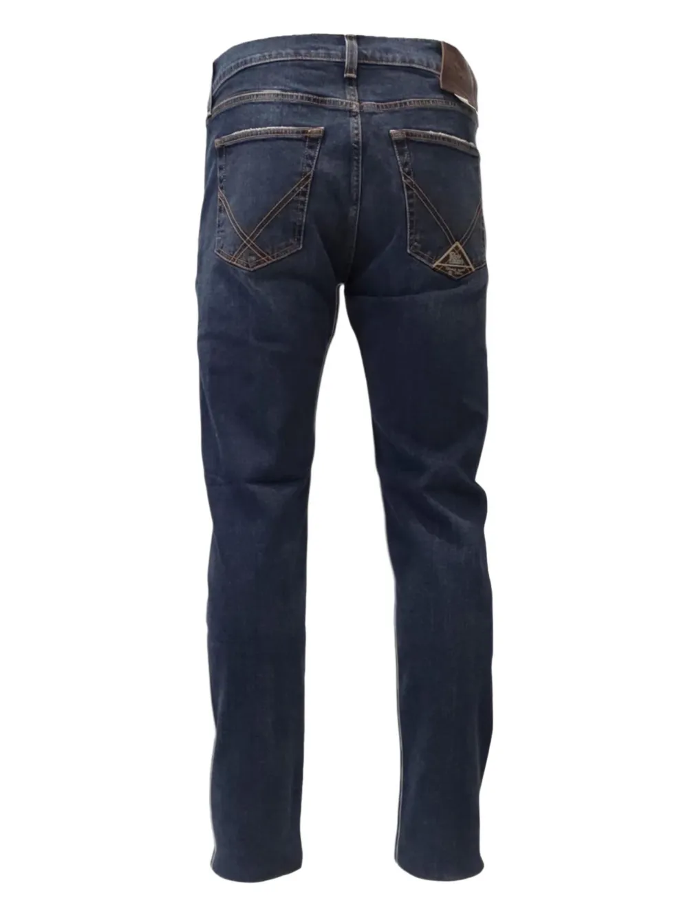 blue logo patch belt loops button fastening