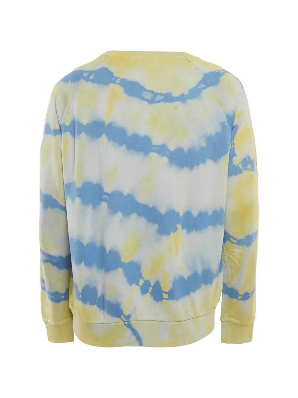 blue and yellow distressed detailing tie-dye pattern knit round neck long sleeves Condition: GOOD. This previously owned and used item is in good condition with minimal signs of use. This may include fading of material or plating and scratches.