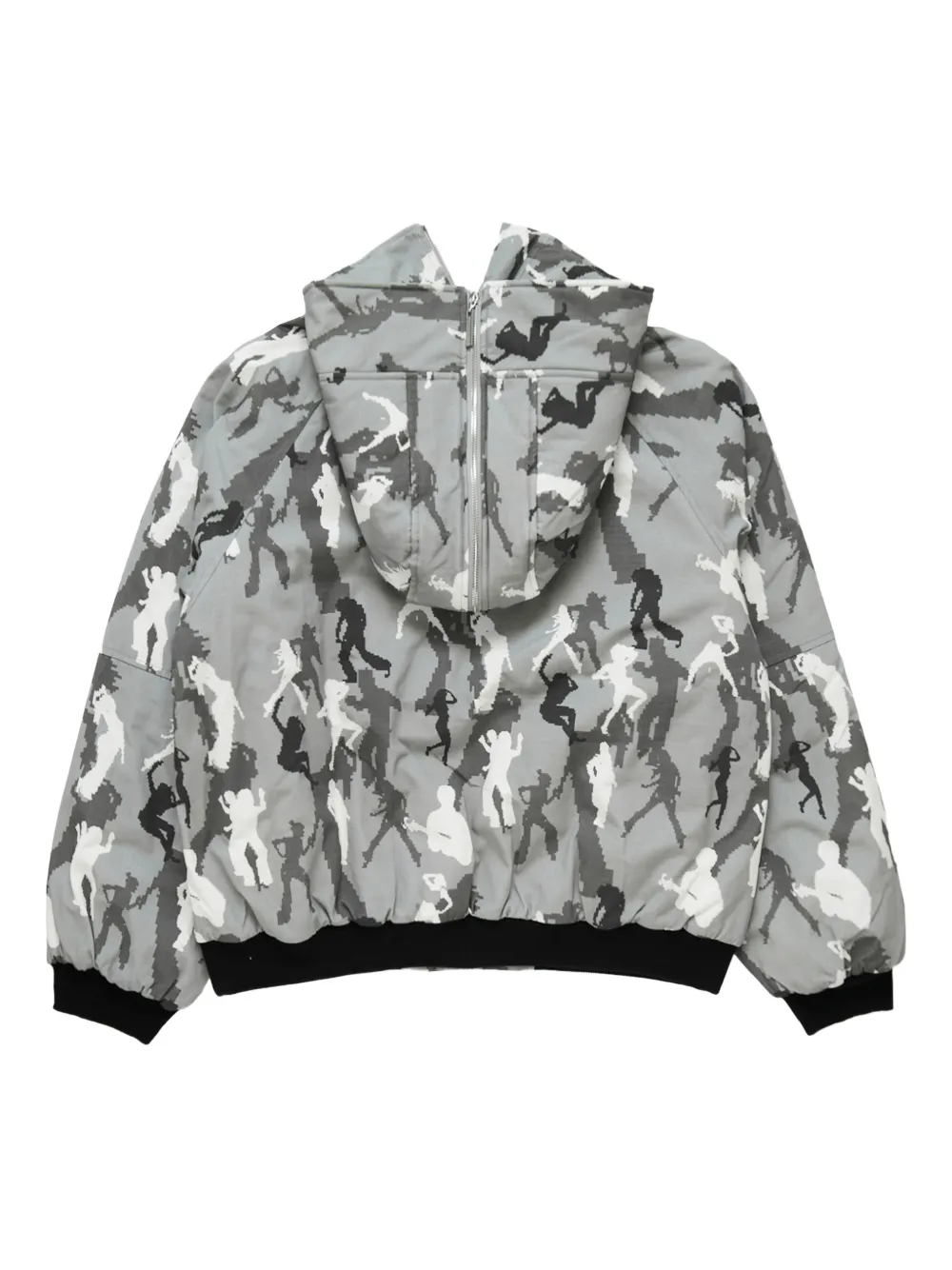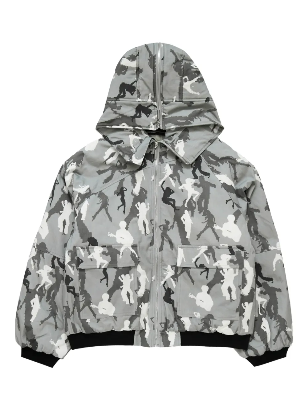 grey, white, and black camouflage pattern zip fastening hood front pockets ribbed hem