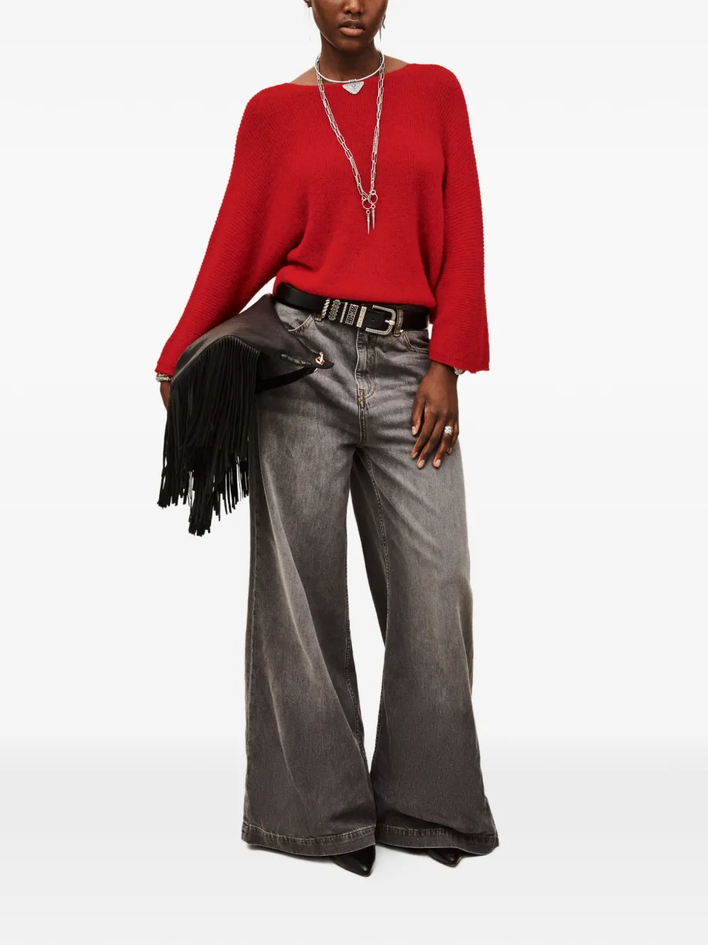 red button fastening to the reverse V-neck at the front or back long sleeves wide sleeves