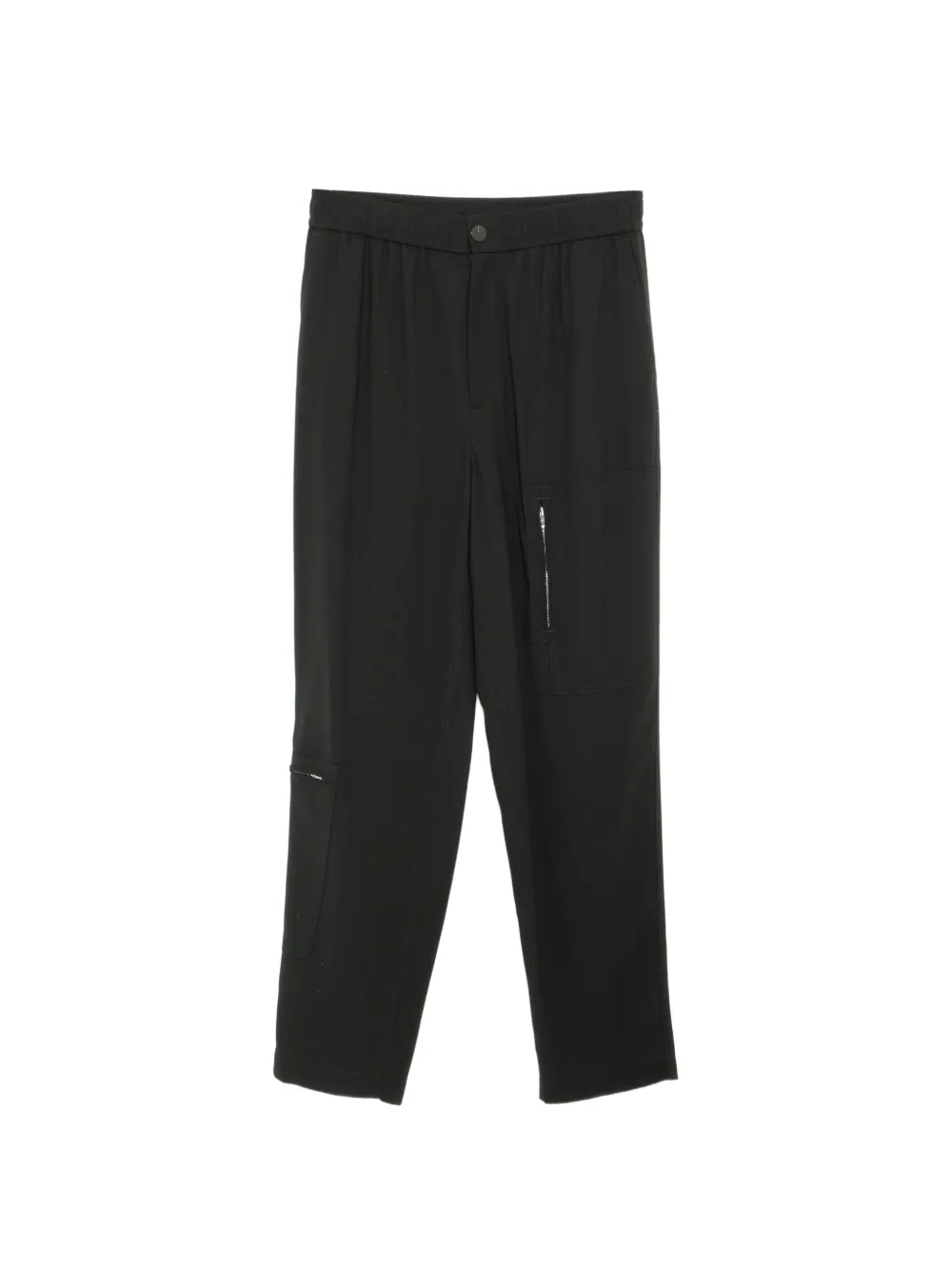 black elasticated waistband with internal drawstring front button and zip fastening two rear patch pockets side seam pockets side zip pockets