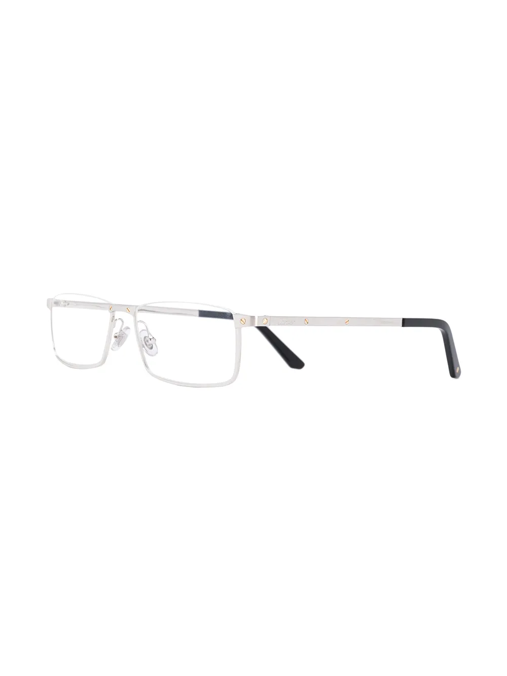 Silver-toned metal rectangular frame glasses from Cartier Eyewear featuring a straight bridge, a logo at the temple and straight arms with angled tips. This item comes with a protective case.