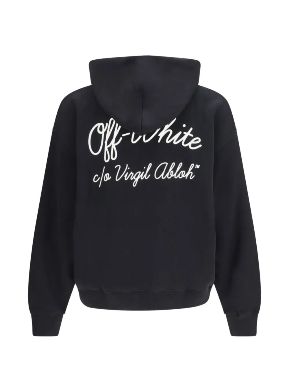 black drawstring hood front pouch pocket script detail ribbed hem ribbed cuffs