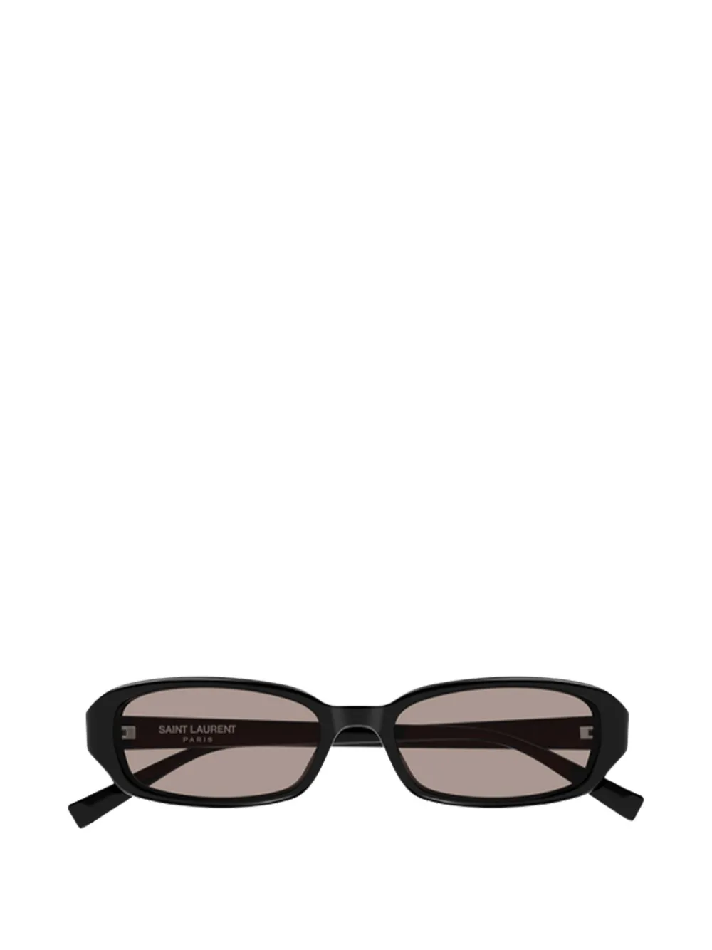 black rectangle frame tinted lenses logo lettering at the arms nose pads straight arms curved tips These glasses come with a protective case.