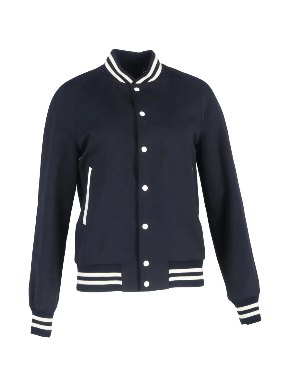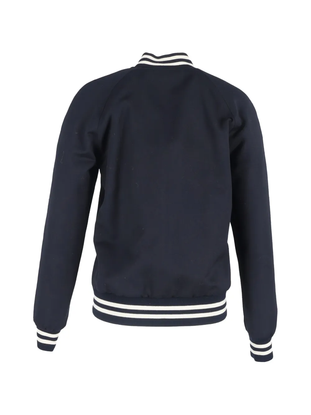 navy blue striped trim raglan sleeves two side welt pockets front press-stud fastening ribbed collar ribbed cuffs and hem relaxed fit Condition: GOOD. This previously owned and used item is in good condition with minimal signs of use. This may include fading of material or plating and scratches.